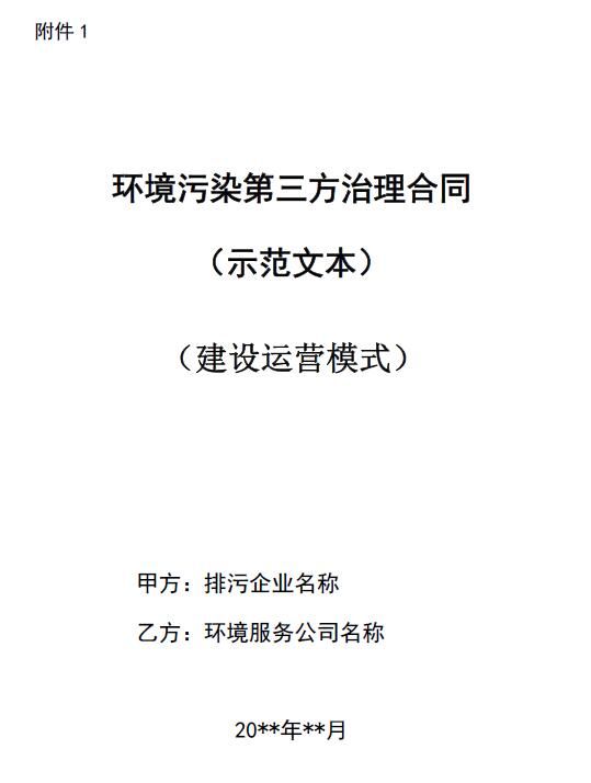 为指导和推动环境污染第三方治理相关工作,根据《国务院办公厅关于推行环境污染第三方治理的意见》(国办发[2014]69号),我们组织编制了《环境污染第三方治理合同(示范文本)》(建设运营模式和委托运营模式),现印发你们,供有关单位和企业在推进环境污染第三方治理相关工作中参考。