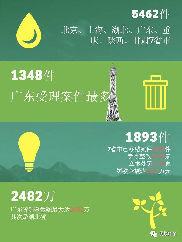 截至12月10日晚8时,中央环保督察组共向北京、上海、湖北、广东、重庆、陕西、甘肃7省市交办群众举报案件5462件。其中,广东省受理的数量最多,为1348件。目前7省市已办结中央环保督察组交办的案件1893件,责令整改2425家,立案处罚1479家,罚款金额达6614万元。其中,广东省罚金数额最大达2482万,其次是湖北省。